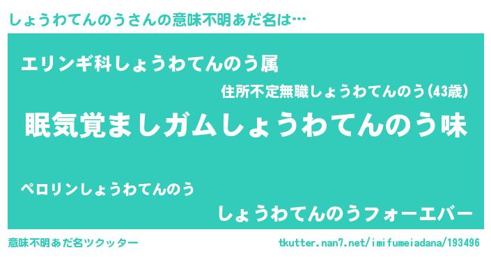 | 男性向けラノベタイトル風あだ名 | 『ノーゲーム・ノーショウワテンノウ』 |