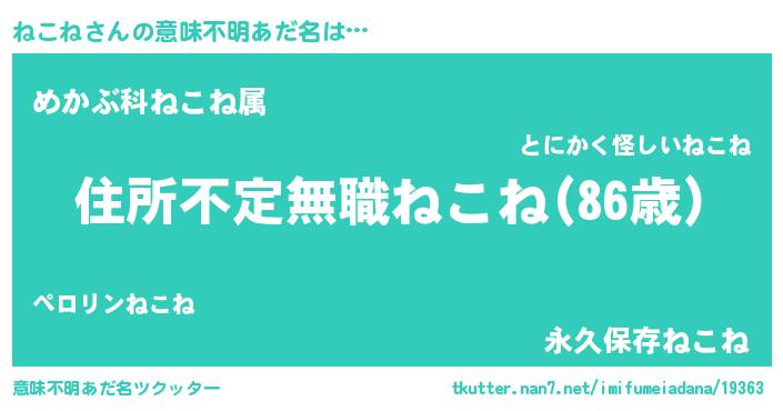 | 男性向けラノベタイトル風あだ名 | 『魔弾の王とねこね』『ネコネスレイヤー』 |