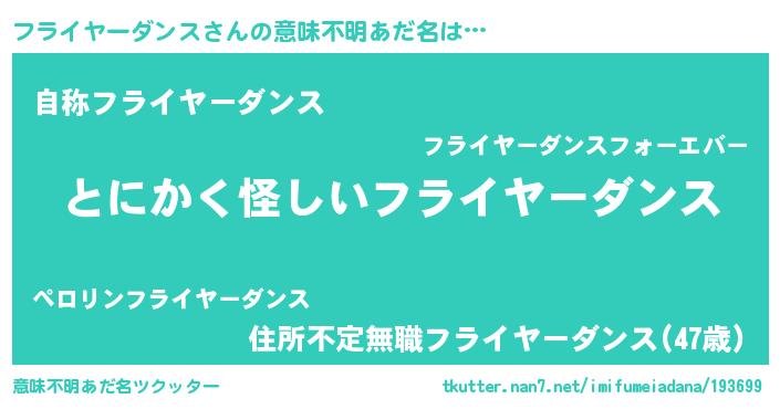 | 男性向けラノベタイトル風あだ名 | 『ダンジョンにフライヤーダンスを求めるのは間違っているだろうか』 |