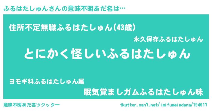 | 女子向けラノベタイトル風あだ名 | 『ふるはたしゅん様がみてる』 |