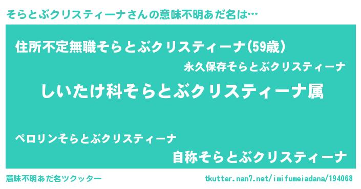 | 男性向けラノベタイトル風あだ名 | 『ソラトブクリスティーナスレイヤー』 |