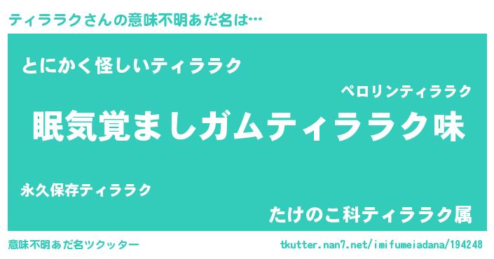 | 男性向けラノベタイトル風あだ名 | 『おまえをオタクにしてやるから、俺をティララクにしてくれ! 』 |