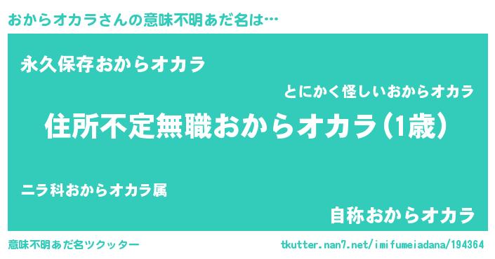 | 女子向けラノベタイトル風あだ名 | 『おからオカラが死なない童話 林檎のおからオカラの診療簿』 |