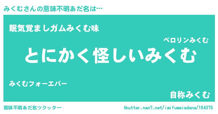 | 胡散臭い通販商品みたいなあだ名 | 『信頼と実績のサプリメント…その名も「みくむ」』 |