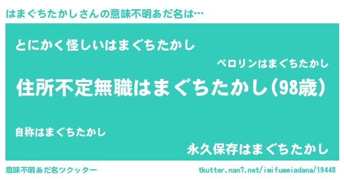 | 男性向けラノベタイトル風あだ名 | 『この素晴らしい世界にはまぐちたかしを!』 |