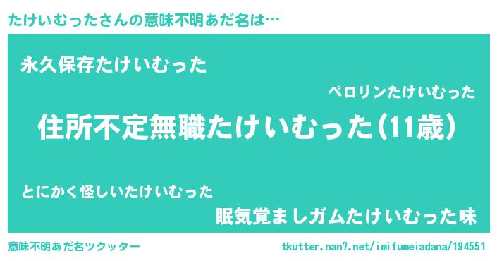 | 男性向けラノベタイトル風あだ名 | 『たけいむったに滅ぼされるだけの簡単なお仕事です』 |