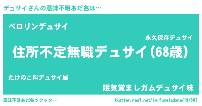 | 男性向けラノベタイトル風あだ名 | 『この素晴らしい世界にデュサイを!』 |