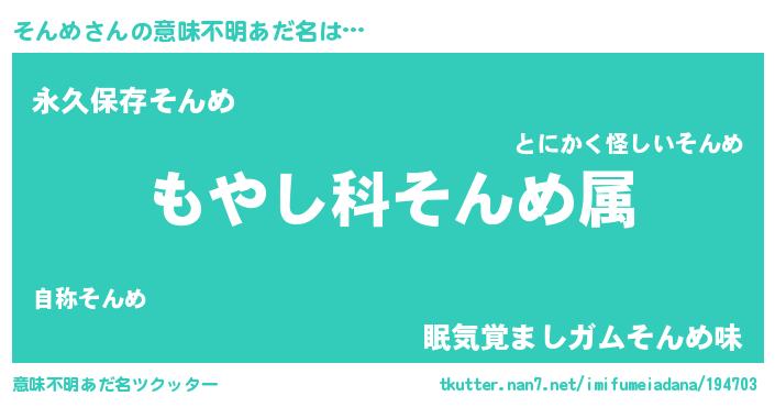 | 胡散臭い通販商品みたいなあだ名 | 『来世でも幸せになれる健康食品…その名も「そんめ」』 |