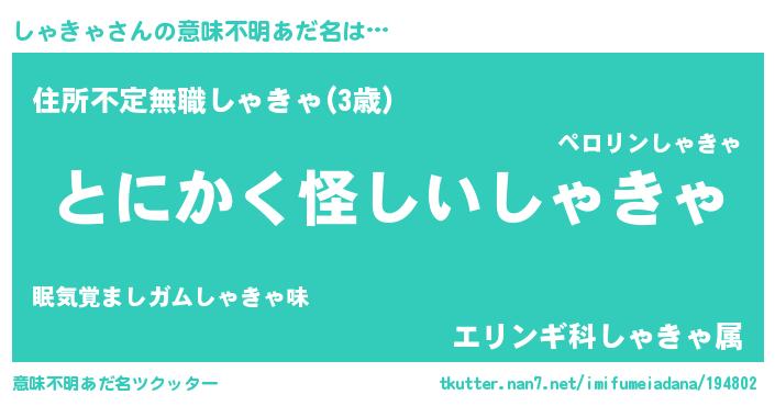 | 男性向けラノベタイトル風あだ名 | 『ダンジョンにしゃきゃを求めるのは間違っているだろうか』 |