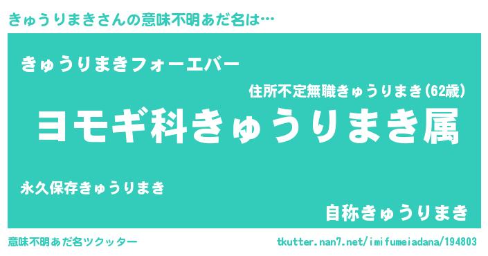 | 男性向けラノベタイトル風あだ名 | 『きゅうりまき~年齢イコール彼女いない歴の魔法使い~』 |