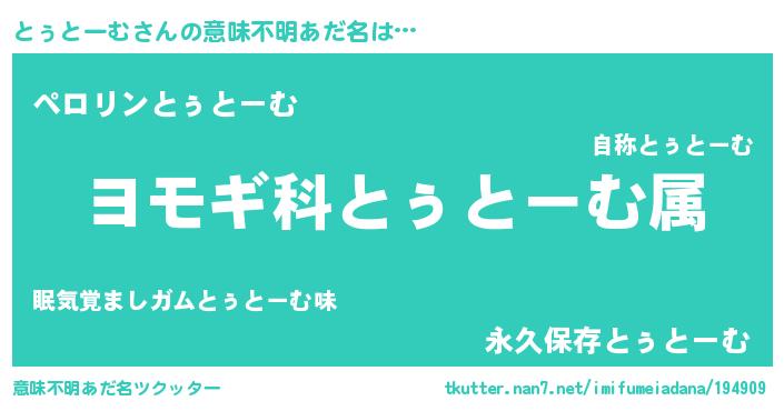 | 男性向けラノベタイトル風あだ名 | 『とぅとーむ~年齢イコール彼女いない歴の魔法使い~』 |
