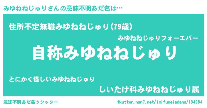 | 男性向けラノベタイトル風あだ名 | 『Re:みゆねねじゅりから始める異世界生活』 |