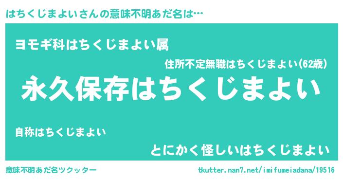 | 男性向けラノベタイトル風あだ名 | 『はちくじまよいという概念が存在しない退屈な世界 』 |