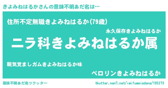 | 女子向けラノベタイトル風あだ名 | 『きよみねはるかの玉の輿計画!』 |