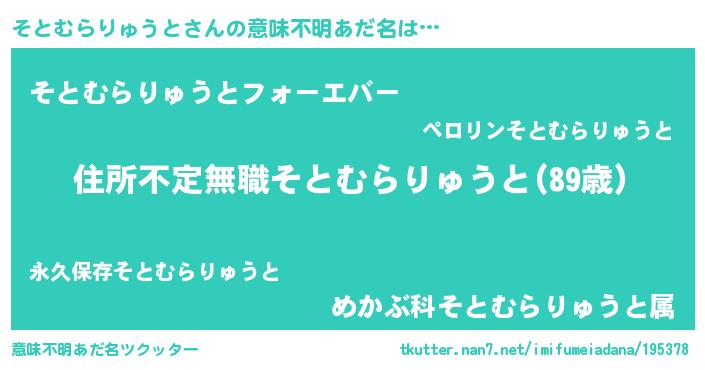 | 男性向けラノベタイトル風あだ名 | 『この素晴らしい世界にそとむらりゅうとを!』 |