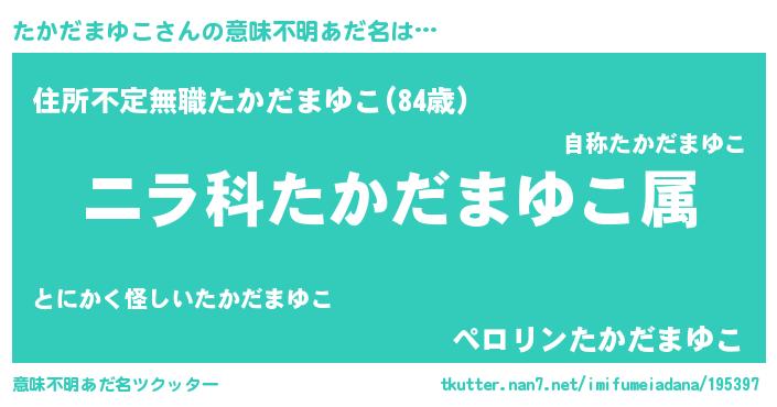 | 男性向けラノベタイトル風あだ名 | 『たかだまゆこ~年齢イコール彼女いない歴の魔法使い~』 |
