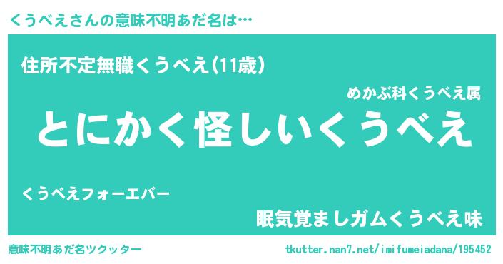 | 男性向けラノベタイトル風あだ名 | 『ダンジョンにくうべえを求めるのは間違っているだろうか』 |