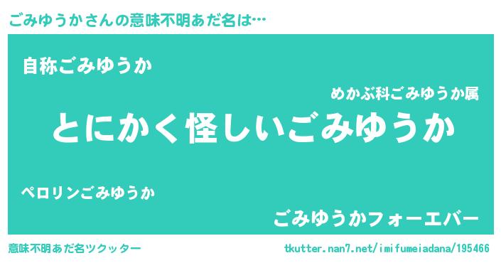 | 胡散臭い通販商品みたいなあだ名 | 『信頼と実績のサプリメント…その名も「ごみゆうか」』 |