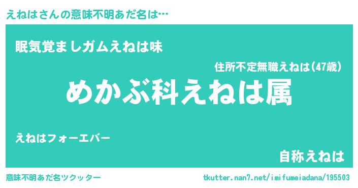 | 料理風あだ名 | 『えねはごはん』『えねはのトマト煮』 |