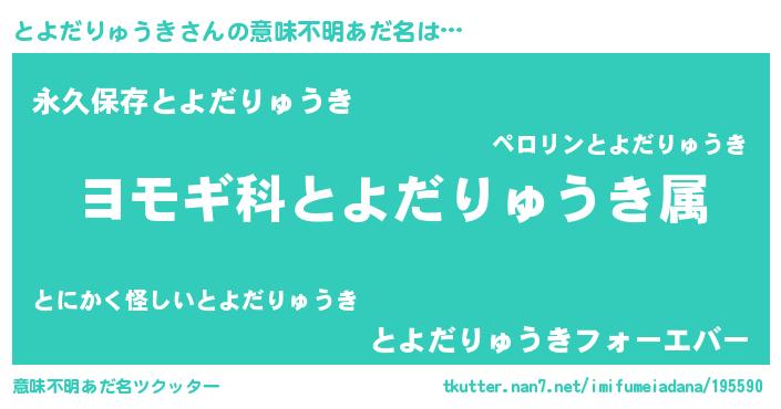 | 男性向けラノベタイトル風あだ名 | 『とよだりゅうき~年齢イコール彼女いない歴の魔法使い~』 |