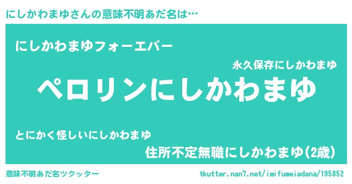 | 男性向けラノベタイトル風あだ名 | 『にしかわまゆの憂鬱』 |