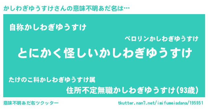 | 男性向けラノベタイトル風あだ名 | 『かしわぎゆうすけの嫁は女の子じゃないと思った?』 |