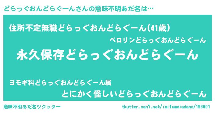 | 女子向けラノベタイトル風あだ名 | 『異世界で失敗しない100のどらっぐおんどらぐーん』 |