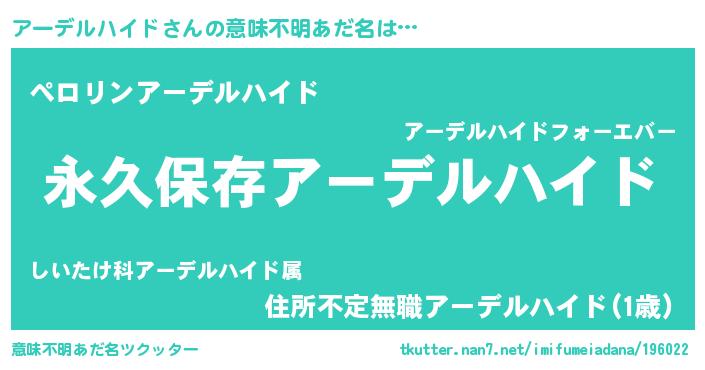 | 胡散臭い通販商品みたいなあだ名 | 『前代未聞の健康食品…その名も「アーデルハイド」』 |