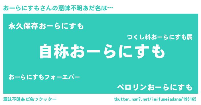 | 男性向けラノベタイトル風あだ名 | 『Re:おーらにすもから始める異世界生活』 |