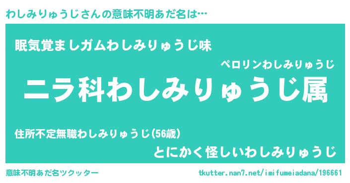 | 男性向けラノベタイトル風あだ名 | 『わしみりゅうじ~年齢イコール彼女いない歴の魔法使い~』 |