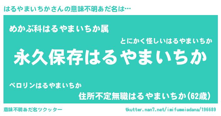 | 胡散臭い通販商品みたいなあだ名 | 『絶対に幸福をもたらす水素水…その名も「はるやまいちか」』 |