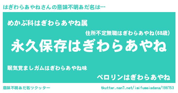 | 胡散臭い通販商品みたいなあだ名 | 『前代未聞の健康食品…その名も「はぎわらあやね」』 |