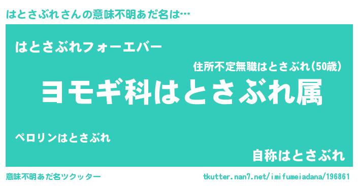 | 男性向けラノベタイトル風あだ名 | 『はとさぶれ~年齢イコール彼女いない歴の魔法使い~』 |
