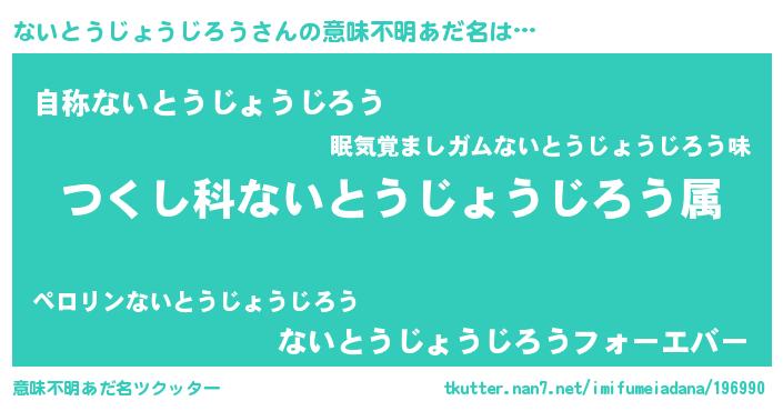 | 男性向けラノベタイトル風あだ名 | 『ないとうじょうじろう~年齢イコール彼女いない歴の魔法使い~』 |