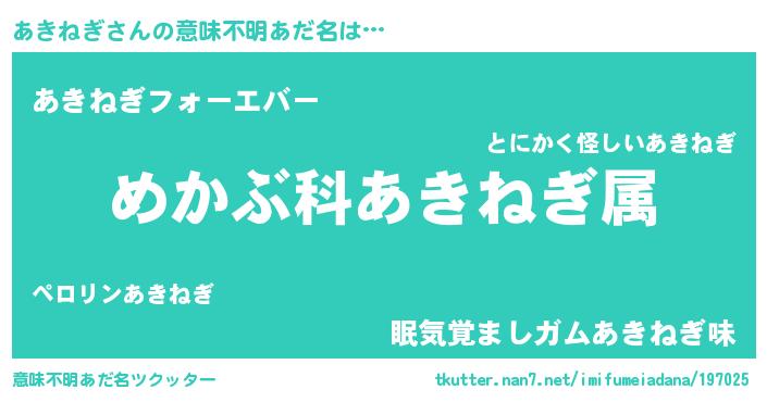 | 男性向けラノベタイトル風あだ名 | 『アキネギスレイヤー』『あきねぎの憂鬱』 |