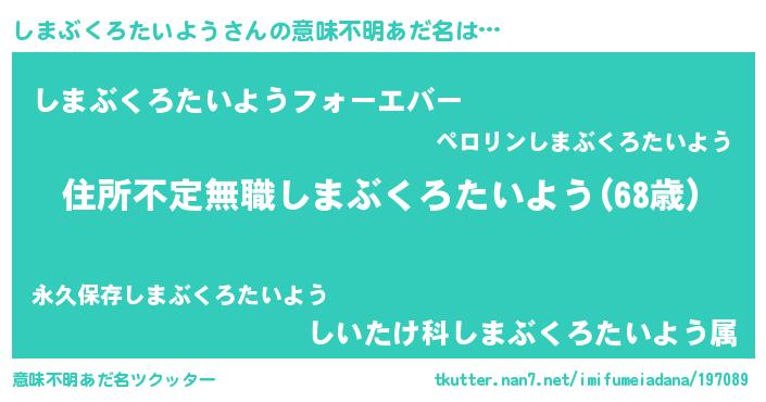 | 伝説のあだ名 | 『秘められし忍者しまぶくろたいよう』 |