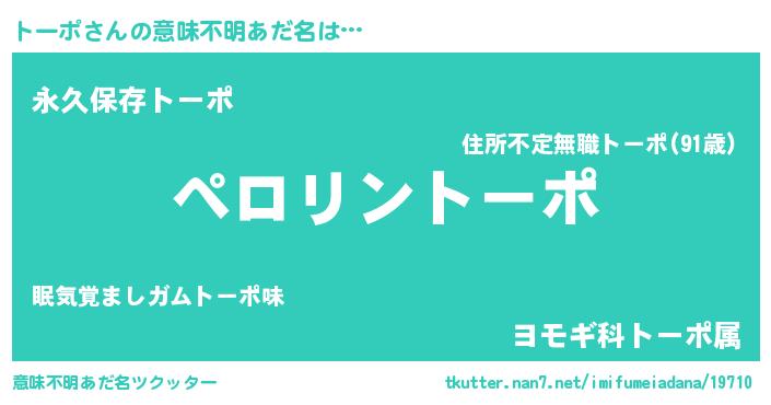 | 男性向けラノベタイトル風あだ名 | 『トーポアートオンライン』 |
