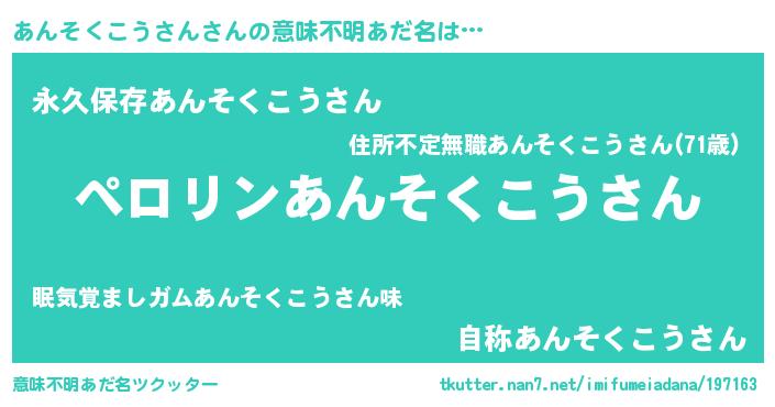 | 男性向けラノベタイトル風あだ名 | 『アンソクコウサンアートオンライン』 |