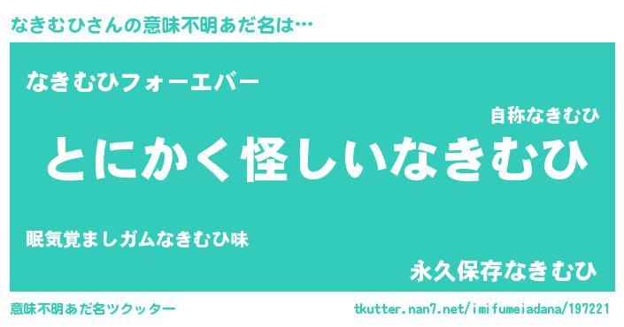 | 男性向けラノベタイトル風あだ名 | 『なきむひに滅ぼされるだけの簡単なお仕事です』 |