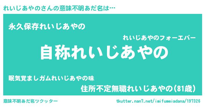 | 男性向けラノベタイトル風あだ名 | 『Re:れいじあやのから始める異世界生活』 |