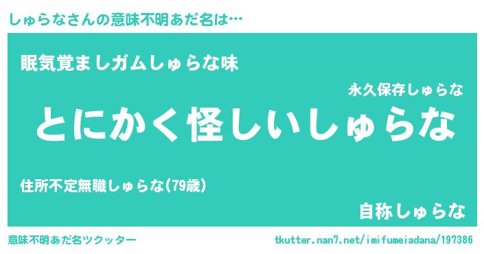 | ヒーロー風カッコイイあだ名 | 『幻影騎士シュ』『慈愛の使者しゅらな』 |