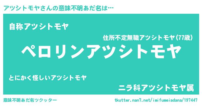 | 男性向けラノベタイトル風あだ名 | 『アツシトモヤアートオンライン』 |