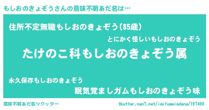 | 男性向けラノベタイトル風あだ名 | 『転生したらもしおのきょぞうだった件』 |