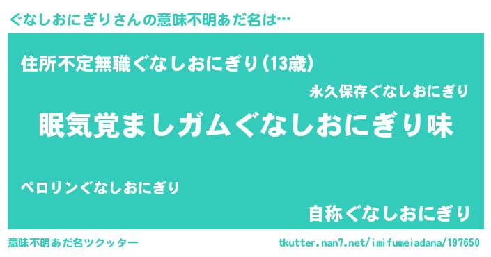| 女子向けラノベタイトル風あだ名 | 『死神ぐなしおにぎりの再婚』 |