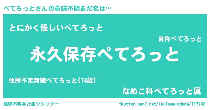 | 男性向けラノベタイトル風あだ名 | 『ぺてろっとという概念が存在しない退屈な世界 』 |