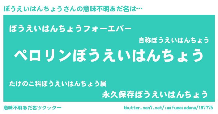 | 男性向けラノベタイトル風あだ名 | 『ボウエイハンチョウアートオンライン』 |