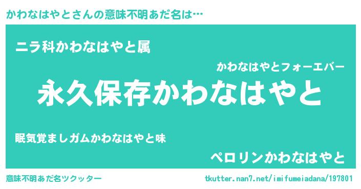 | 胡散臭い通販商品みたいなあだ名 | 『来世でも幸せになれる水素水…その名も「かわなはやと」』 |