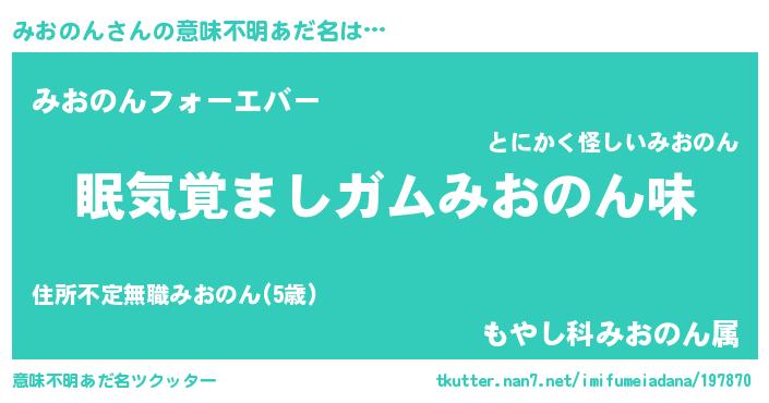 | 男性向けラノベタイトル風あだ名 | 『みおのんに滅ぼされるだけの簡単なお仕事です』 |