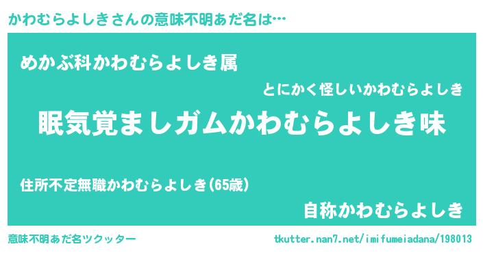 | 男性向けラノベタイトル風あだ名 | 『ノーゲーム・ノーカワムラヨシキ』 |