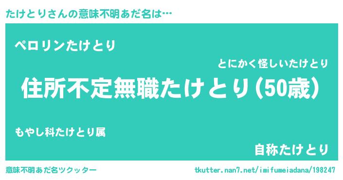 | 男性向けラノベタイトル風あだ名 | 『うちのたけとりが世界を掌握している!』 |